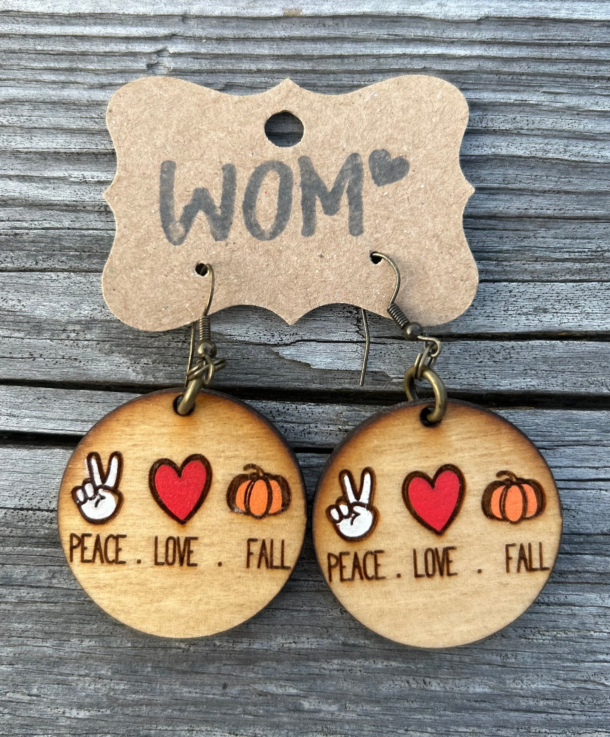 Add a touch of fall to your style with our Peace Love Fall Wooden Dangle Earrings featuring a quirky pumpkin design. Show off your love for autumn with these playful and unique earrings. Perfect for adding a bit of fun to any outfit.